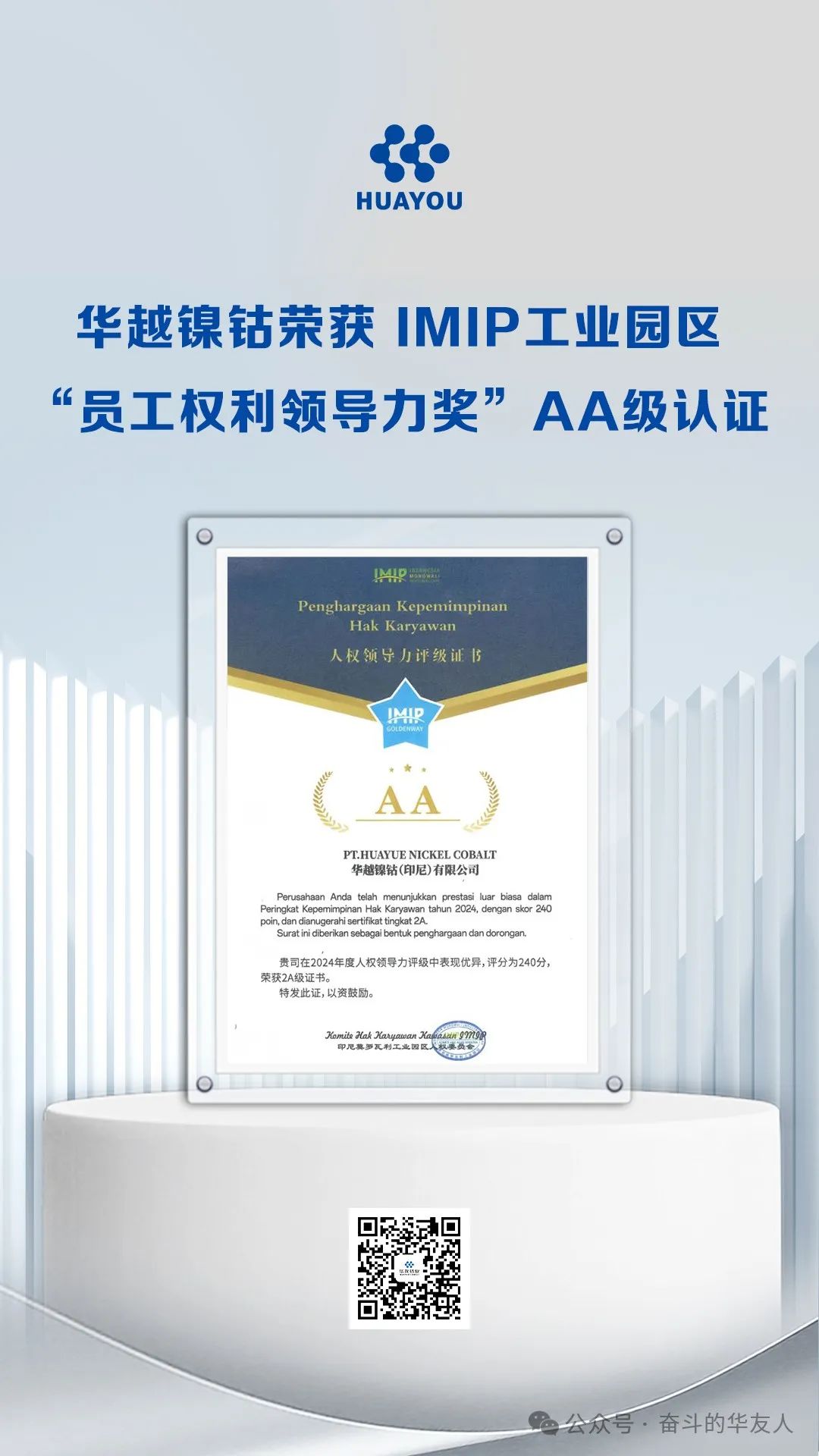 Recently, Huayue Nickel and Cobalt (Indonesia) Co., Ltd. has been awarded the prestigious AA-level certification by the Human Rights Committee of the IMIP Morowali Industrial Park in Indonesia for its outstanding employee management system and human rights practices. With a remarkable score of 240 points in the 2024 Employee Rights Leadership Evaluation, the company solidified its leadership in human resource management and labor rights protection.
