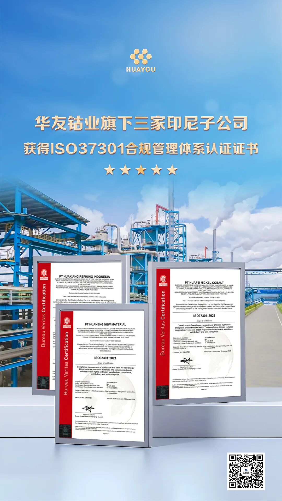 On September 12th, three Indonesian subsidiaries of Huayou Cobalt—Huafei Nickel Cobalt (Indonesia) Co., Ltd., Huaxiang Refining Indonesia Co., Ltd., and Huaneng New Materials Co., Ltd.—received the ISO 37301 Compliance Management System Certification from Bureau Veritas. This marks Huayou Cobalt's full integration into international compliance standards for its new energy lithium battery material integrated industrial base in Indonesia, laying a solid foundation for global development.