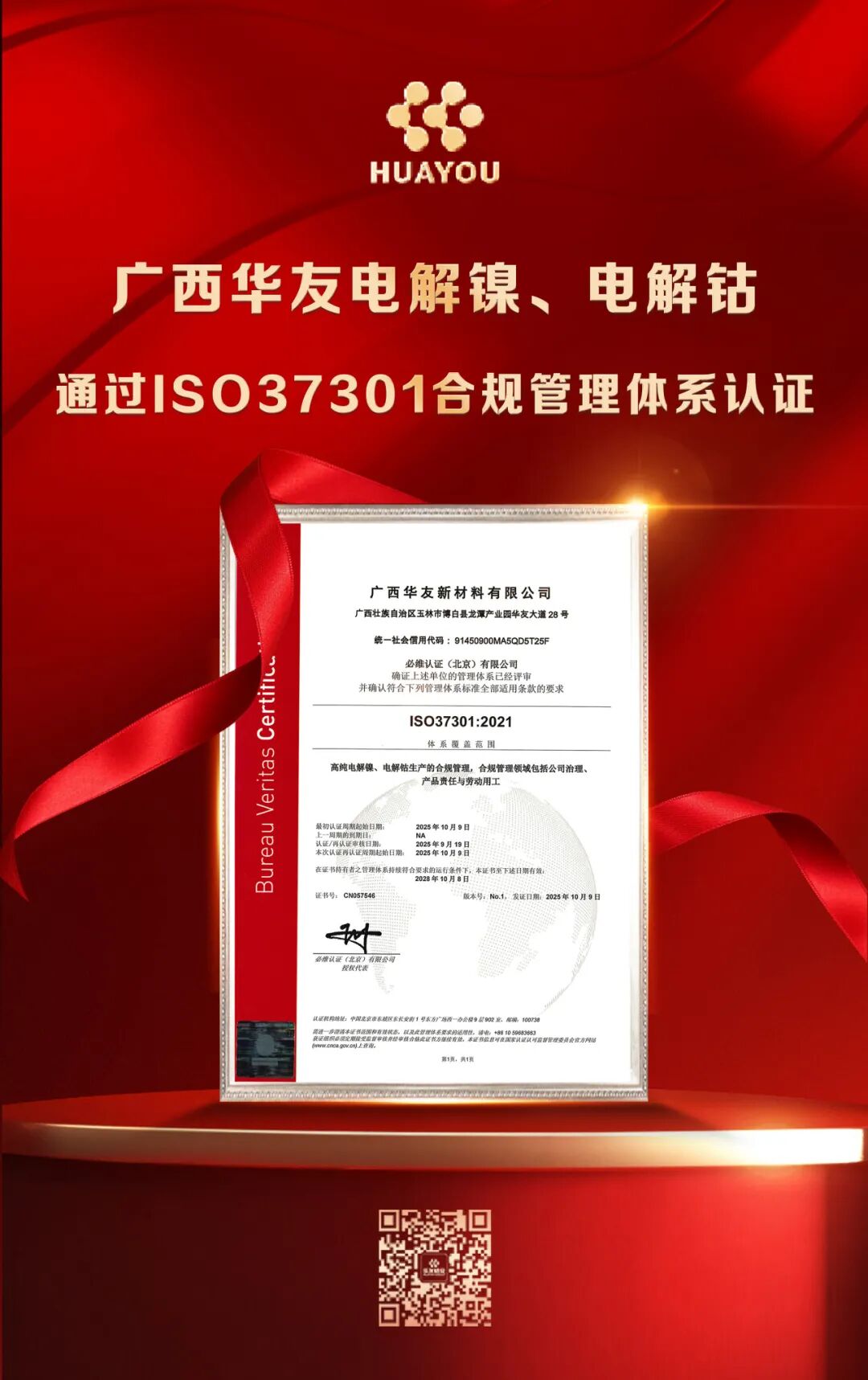 Guangxi Huayou's Electrolytic Nickel and Electrolytic Cobalt Awarded ISO 37301 Compliance Management System Certification