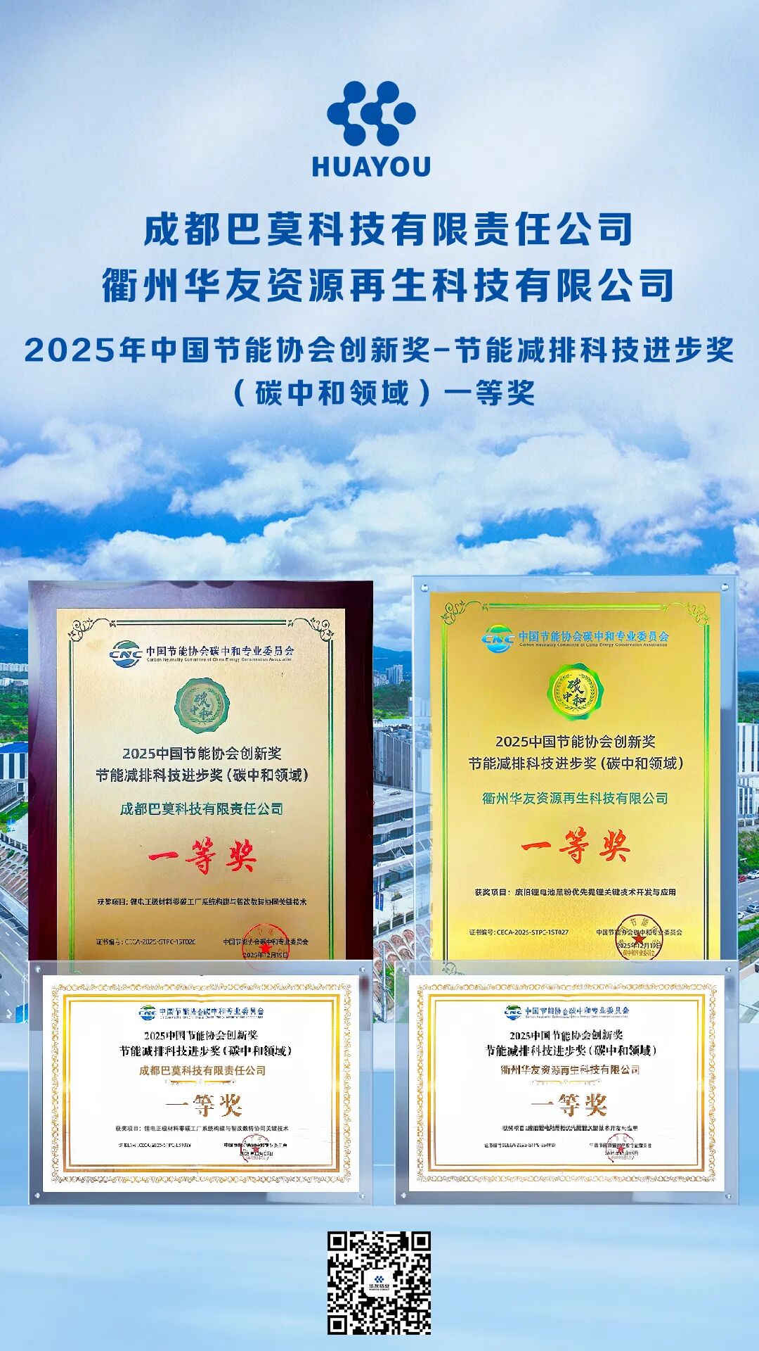 Recently, at the 5th Carbon Neutrality Boao Conference hosted by China Energy Conservation Group in Boao, Hainan, two Huayou subsidiaries — Chengdu Bamo Technology Co., Ltd. and Quzhou Huayou Resource Recycling Technology Co., Ltd. — successfully defended the title of "First Prize of the 2025 China Energy Conservation Association (CECA) Innovation Award - Technological Progress Award for Energy Conservation and Emission Reduction (Carbon Neutrality Field)" with their solid technological innovation and outstanding low-carbon practices. This is a powerful demonstration of Huayou's advantages in the full industrial chain and its efforts to address industry pain points, with each achievement embodying the sweat and wisdom of Huayou people.
