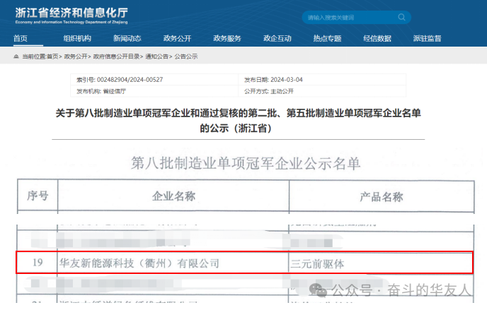 近日,華友新能源科技(衢州)有限公司(以下簡(jiǎn)稱“華友新能源衢州”)成功入選——第八批制造業(yè)單項(xiàng)冠軍企業(yè)名單,展現(xiàn)出了公司在新能源鋰電材料領(lǐng)域卓越的技術(shù)創(chuàng)新能力和市場(chǎng)領(lǐng)導(dǎo)力。