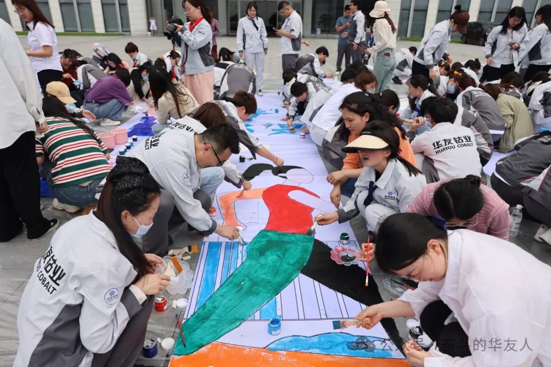 隨著畫布的鋪開,第二個項目開始?;顒又?,大家拿起手中的畫筆,端起五顏六色的顏料,在畫布上恣意揮灑著自己的熱愛與赤誠。通過近1小時的共同創作、潛心描繪,巨畫逐步完成,每一筆都體現出華友人的風采與魅力,每個人都是這幅巨畫誕生過程中不可或缺的一環。