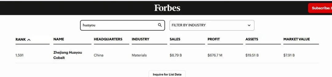 華友鈷業榮列2025福布斯全球企業2000強第1591位