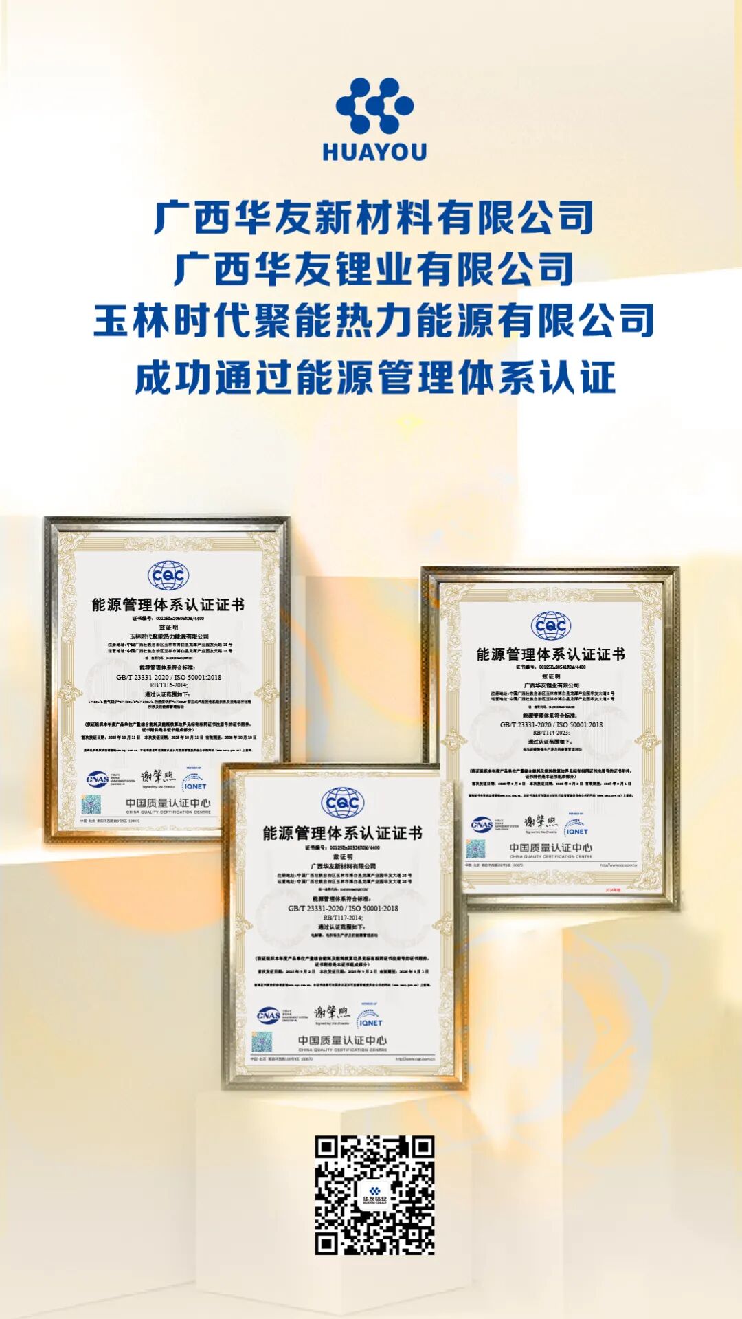 近日,華友鈷業下屬三家子公司傳來喜訊:廣西華友新材料有限公司、廣西華友鋰業有限公司及玉林時代聚能熱力能源有限公司,成功通過ISO50001能源管理體系認證。