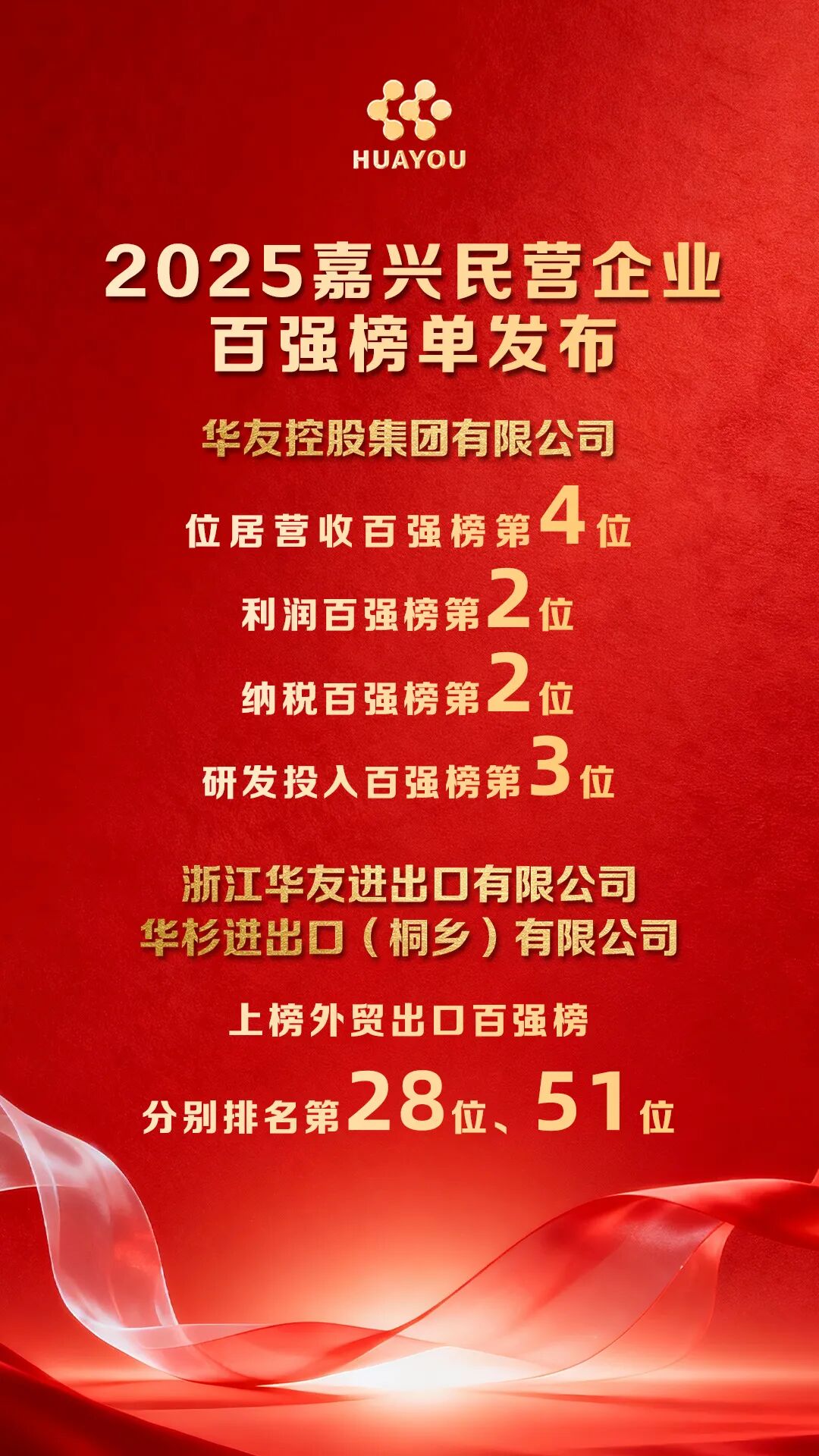華友控股集團有限公司分別位居營收百強榜第4位,利潤榜第2位,研發投入榜第3位,納稅榜第2位。浙江華友進出口有限公司位居外貿出口榜第28位。華杉進出口(桐鄉)有限公司位居外貿出口榜第51位。